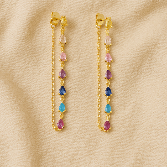 A delicate chain of light and color. The Zaria Rainbow Drop Chain Earrings feature a vertical cascade of teardrop-shaped CZ stones in vibrant rainbow hues, suspended along a slender golden chain. Each stone sparkles with intention, creating a fluid silhouette that dances with every movement.