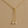 Fluid lines, luminous details. The Soleil Pearl Lariat Necklace features a graceful Y-shaped silhouette finished with twin pearl drops that sway gently from a gold-plated chain.